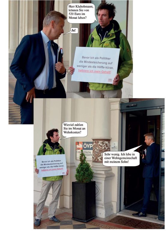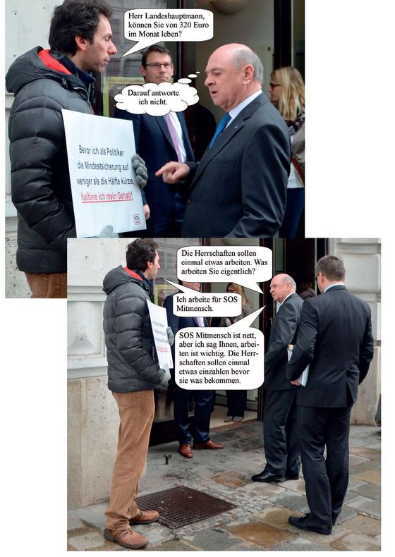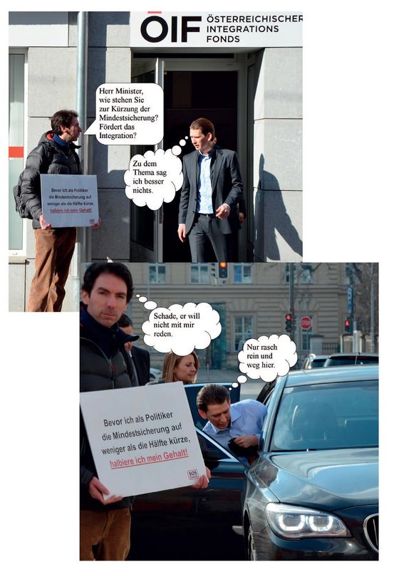Darüber hinaus habe ich verantwortliche PolitikerInnen wie Finanzminister Hans- Jörg Schelling, Vizekanzler Reinhold Mitterlehner, Integrationsminister Sebastian Kurz, ÖVP-Klubobmann Reinhold Lopatka, Ex-Innenministerin Johanna Mikl-Leitner und den niederösterreichischen Landeshauptmann Erwin Pröll direkt mit der Sozialfrage konfrontiert. Mit dem Schild – „Bevor ich als Politiker die Mindestsicherung auf weniger als die Hälfte kürze, halbiere ich mein Gehalt.“ – will ich sagen: Ein Politiker, der auch nur ein wenig Anstand besitzt, muss alles dafür tun, um zu verhindern, dass bei denjenigen gekürzt wird, die am Wenigsten haben. Zuerst wurde eine Kürzung auf 320 Euro im Monat für Asylberechtigte diskutiert, später maximal 520 Euro. Mit diesen Beträgen habe ich die PolitikerInnen konfrontiert. Mein Eindruck: Schelling, Pröll, Kurz, Mitterlehner und viele andere machen sich schon sehr lange keine Gedanken mehr darüber, was es heißt, von einigen hundert Euro im Monat zu leben. Mitterlehner verdient zum Beispiel 733 Euro brutto – am Tag. Ich will ihm nichts wegnehmen. Aber ich finde es nicht gut, wenn jemand, der so viel an nur einem Tag verdient, leichtfertig über Menschen regiert, die vom gleichen Betrag nahezu ein ganzes Monat leben müssen.